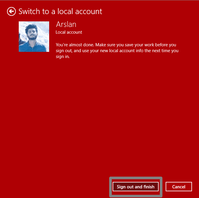 Enfin, cliquez sur “Sign out and finish” afin de finir le passage à un compte local. Votre ordinateur va se connecter avec le compte local après son redémarrage. Vous pouvez maintenant allez dans le panneau de configuration et créer un disque de réinitialisation de mot de passe.