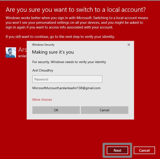 Tapez le mot de passe de votre compte Microsoft actuel puis cliquez sur “Next”.